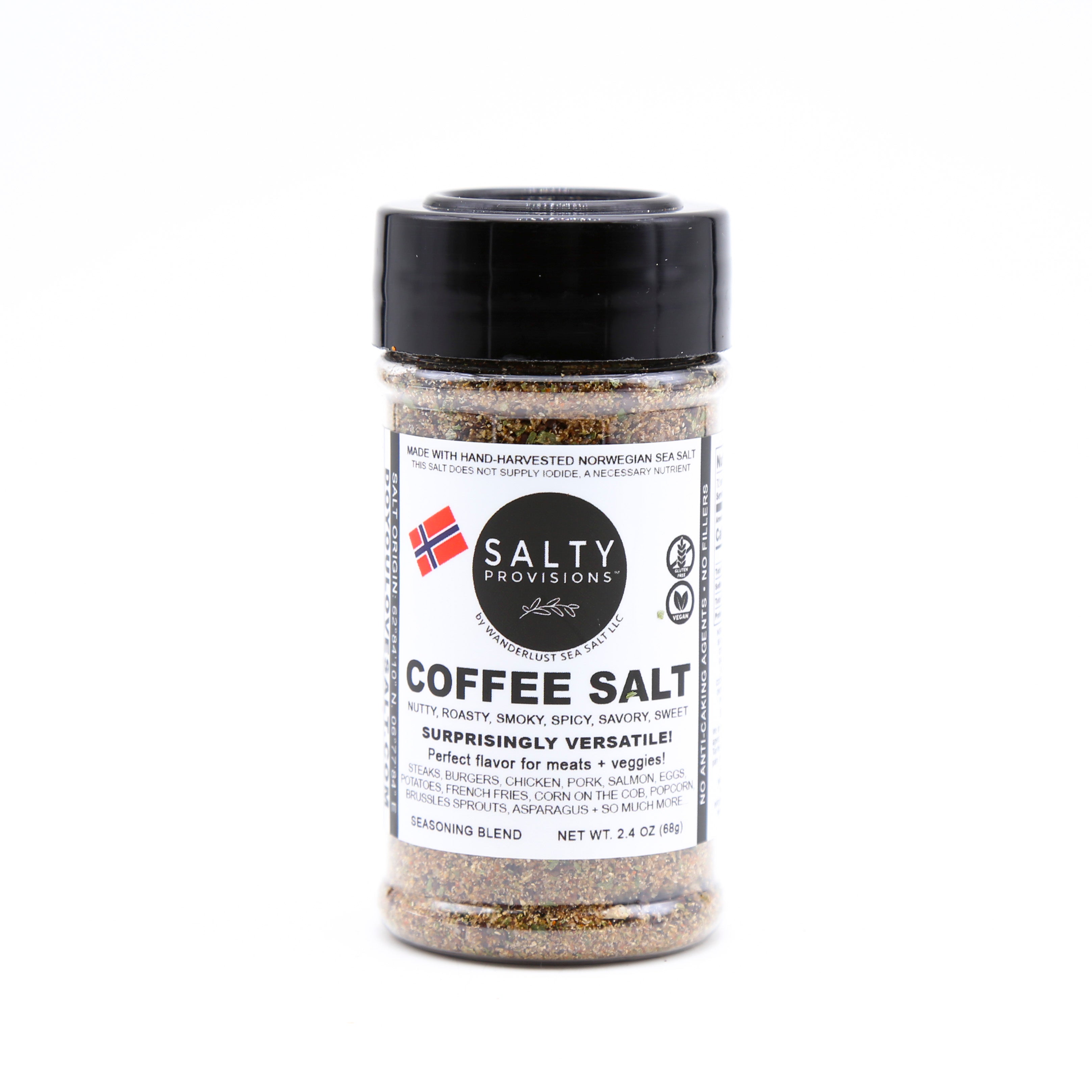 INGREDIENTS: SEA SALT, DARK ROAST COFFEE BEANS, YELLOW ONION, GARLIC, GREEN ONION, ORGANIC COCONUT PALM SUGAR, BLACK PEPPER, PAPRIKA, CAYENNE.