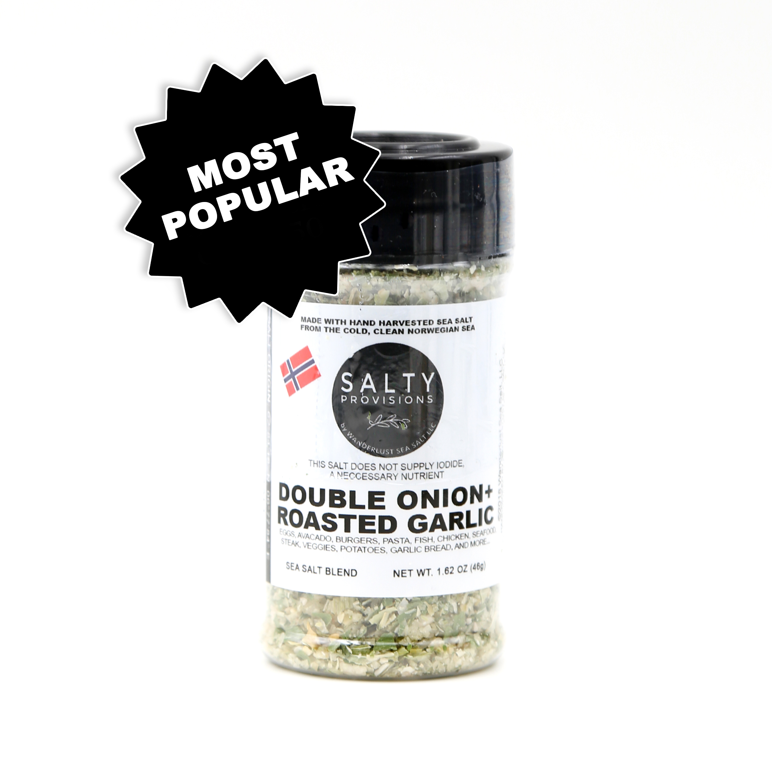 Fresh, crisp Flake Sea Salt hand-harvested from the Norwegian Sea, infused with California Garlic & our amazingly flavorful double onion blend.