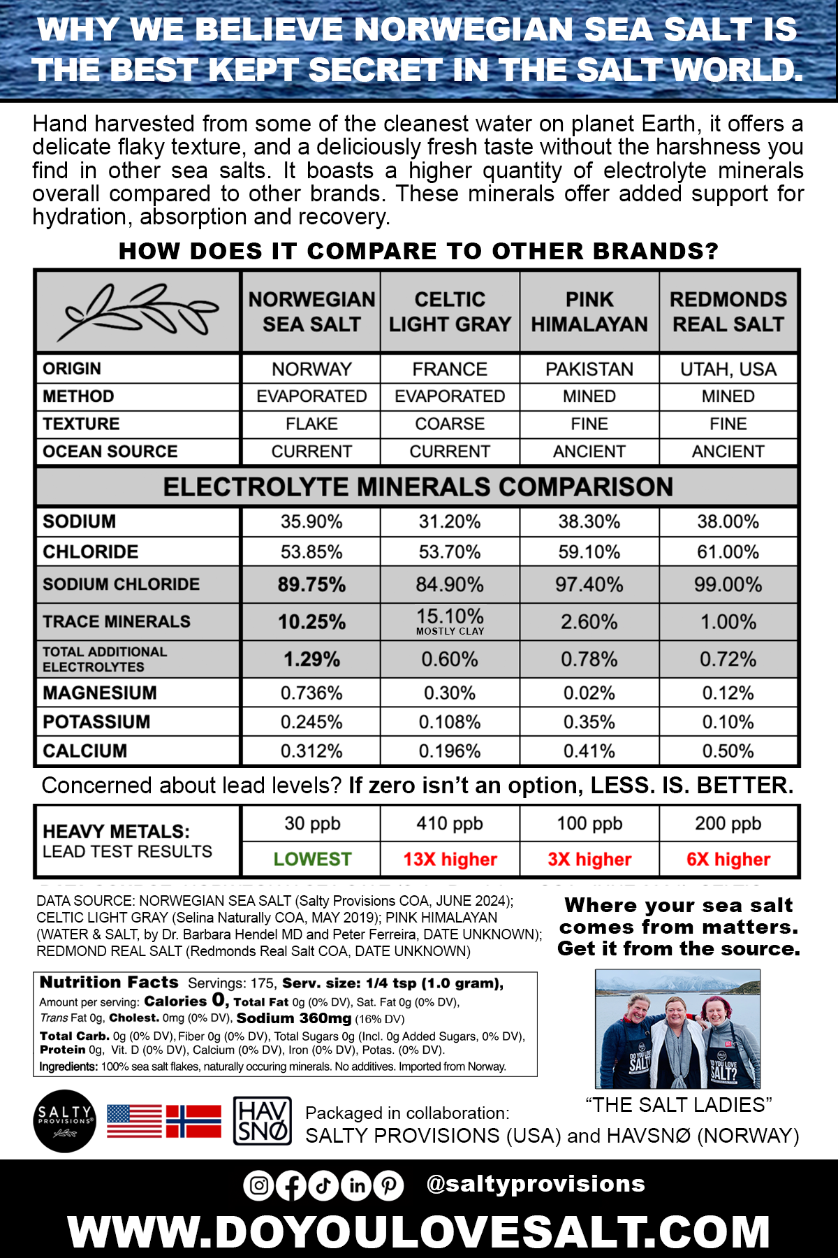 Double the magnesium, nearly triple the potassium over other brands. Hand harvested from the crisp, clean Norwegian Sea.
