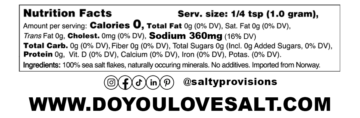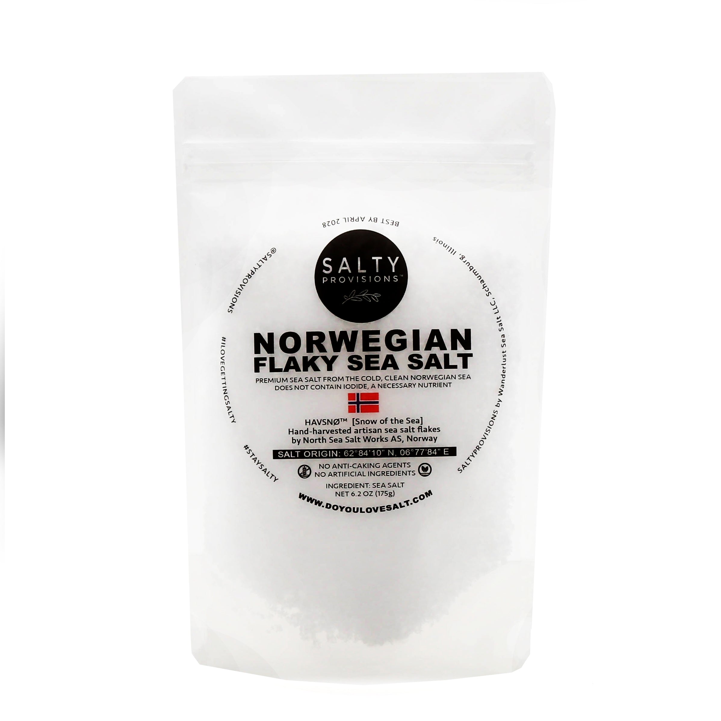 NORWEGIAN FLAKY SEA SALT is hand harvested in Norway by HAVSNØ North Sea Salt Works. Repackaged with permission.