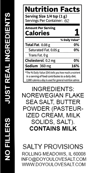 INGREDIENTS: NORWEGIAN FLAKE SEA SALT, GRASS-FED BUTTER POWDER (PASTEURIZED CREAM, MILK SOLIDS). CONTAINS MILK